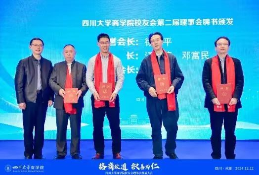 杨光代表校友总会为商学院校友会第二届理事会名誉会长、会长、执行会长颁发聘书;徐玖平为常务副会长、秘书长颁发聘书;江文清、邓富民为副会长颁发聘书;严统明为常务副秘书长、副秘书长颁发聘书;洪清鹏、刘哲义、陈伟生、张黎明、周贵川分别为理事颁发聘书。