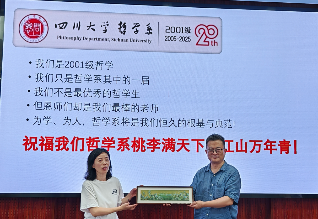 最后,张敏代表2001级本科班同学,以《百“川”归海廿载潮 百“哲”不移初心锚——写在川大01哲学毕业二十载重逢时》为主题,深情回顾了二十四年前同学们在川大哲学系相逢的求学时光,述说了二十年后重逢的欣喜与下次再聚的期盼。发言结束后,张敏代表全体校友向哲学系敬赠了精心准备的毕业二十周年“千里江山图”定制纪念品,以此表达对学校和母系深深的感恩与美好祝福。