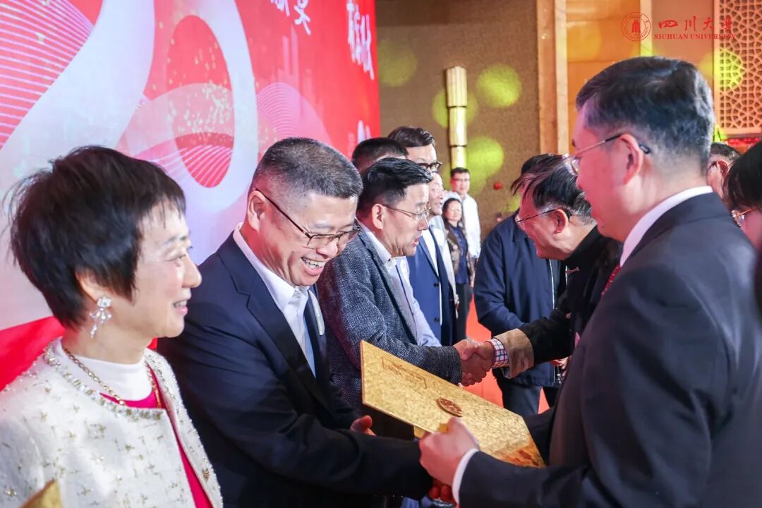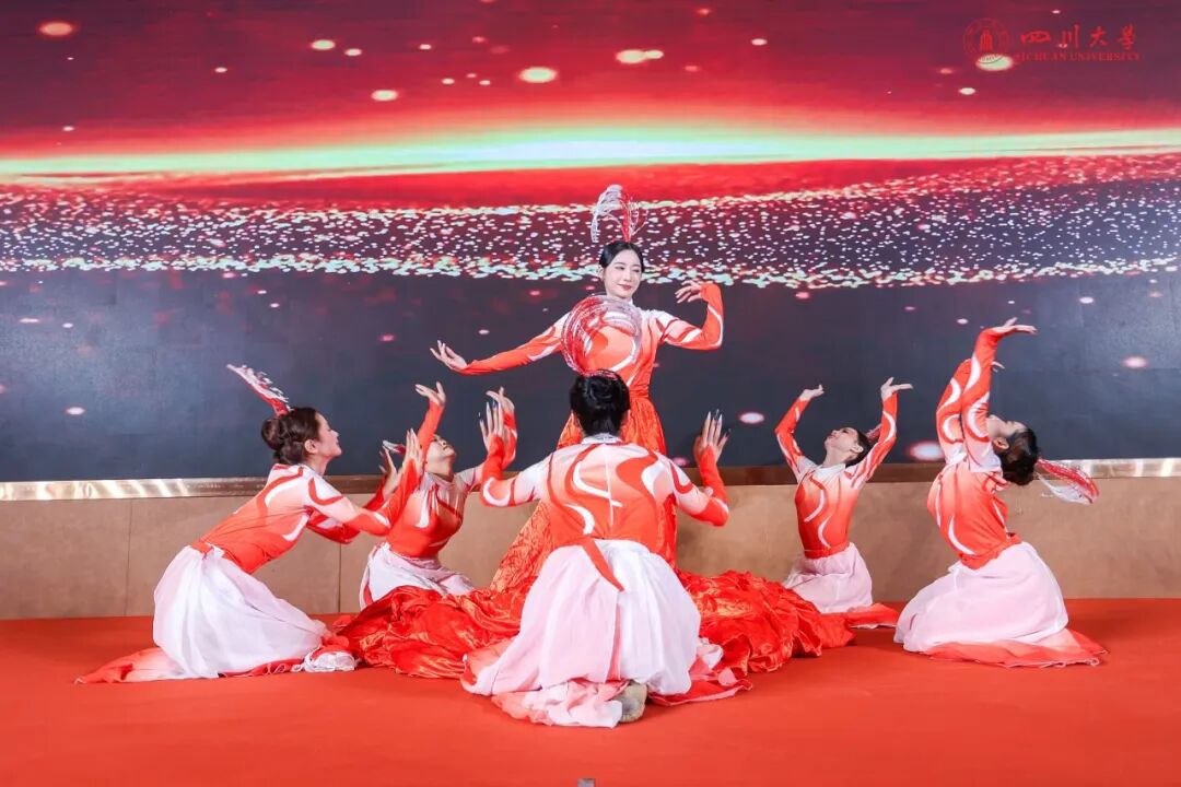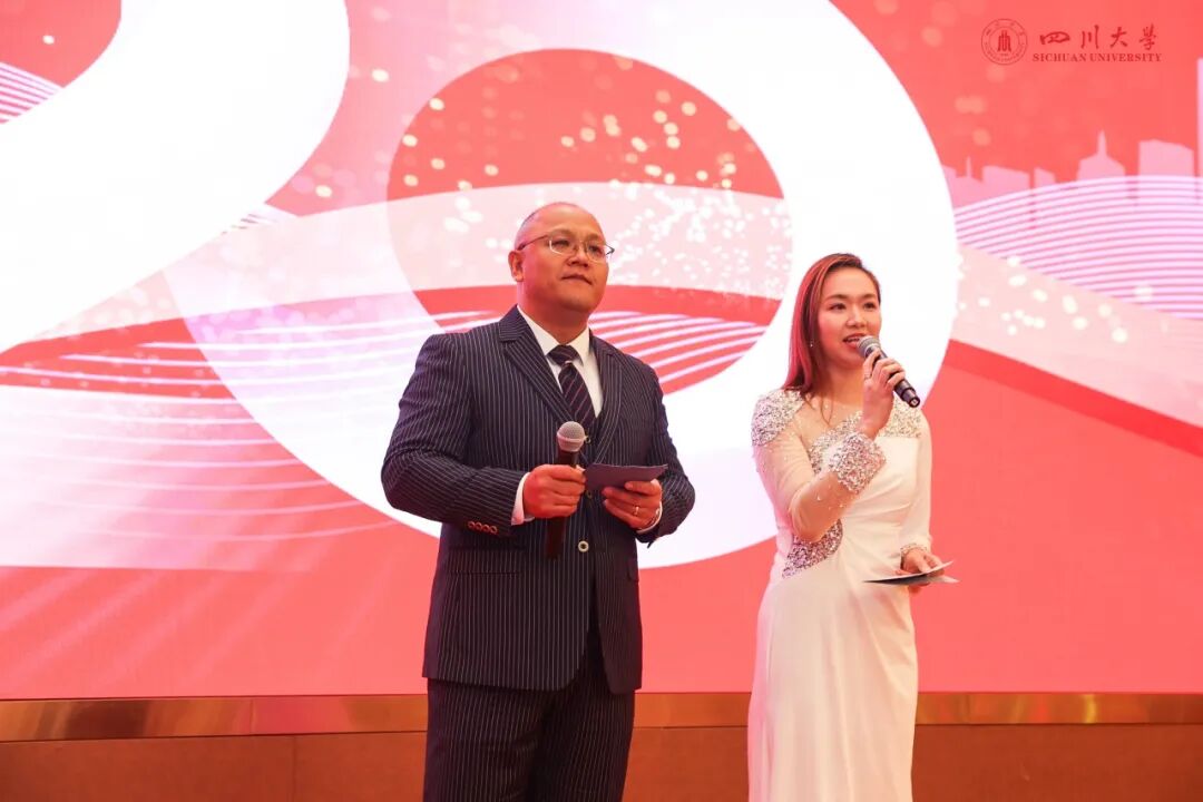 晚宴期间的节目环节精彩纷呈,锣鼓喧天的开场表演气势恢宏,古筝与琵琶合奏《彝族舞曲》婉转悠扬,成都科技大学合唱团的串烧合唱充满情怀,中式舞蹈《雪龙吟》、小提琴独奏《扎恩达勒》、街舞《robot&popping》等节目轮番上演,篮球队合唱《相信自己》、足球队表演《真心英雄》展现了川大校友的青春活力,舞蹈《一路生花》更是为庆典增添了美好寓意。