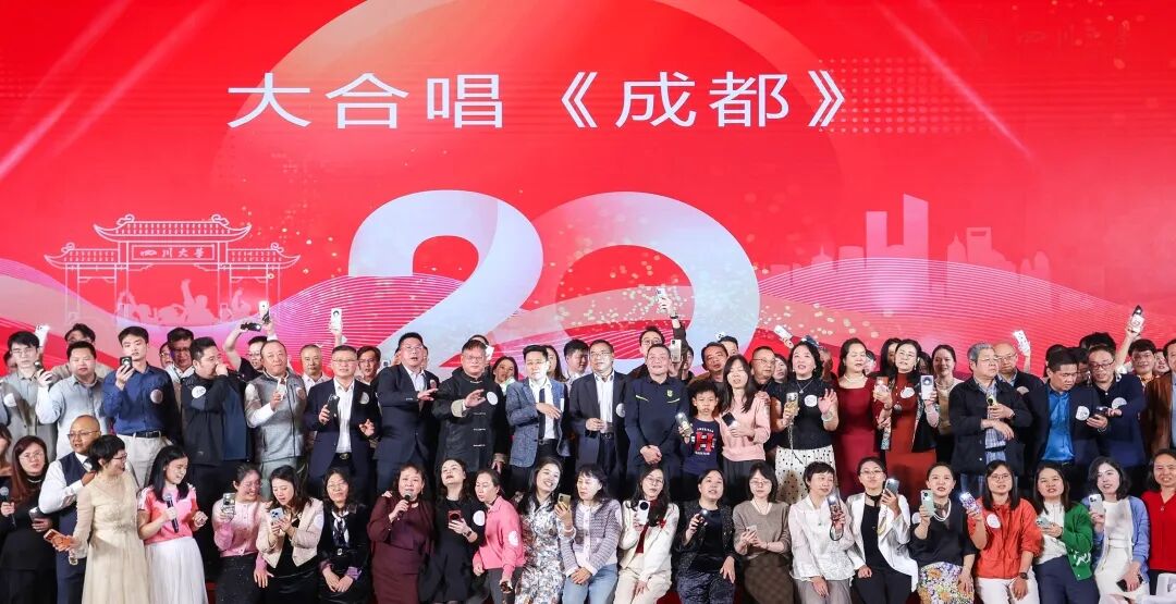 庆典尾声,全体校友共祝母校130周岁生日快乐!齐声合唱《成都》,熟悉的旋律勾起无数青春回忆,望江池畔、华西钟楼、江安长桥的画面在歌声中不断浮现。
