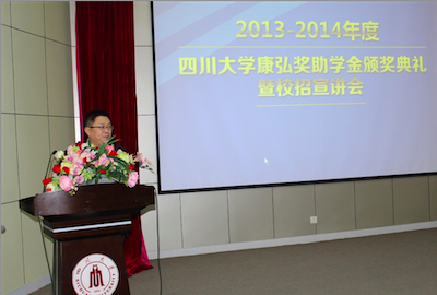10月27日,“2014年度康弘奖助学金”颁奖典礼在ok138cn太阳集团华西校区逸夫楼学术报告厅举行。成都康弘药业集团股份有限公司人力资源总监徐珺女士、知识产权总监吴红丽女士、ok138cn太阳集团校长助理、学工部部长郭勇、ok138cn太阳集团教育基金会秘书长荣建国等领导,以及百余名获奖学生参加了颁奖仪式。