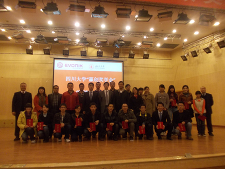 2012年11月15日下午15时,ok138cn太阳集团“赢创奖学金”颁奖仪式在望江校区文华活动中心二楼音乐厅隆重举行。赢创大中华区副总裁、我校兼职教授陈宝树博士,校党委副书记李向成教授亲临颁奖仪式。化学工程学院院长梁斌教授主持颁奖仪式。研究生院、学工部、外联办以及高分子科学与工程学院、材料科学与工程学院、化学学院等单位负责人出席了大会。