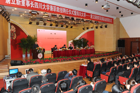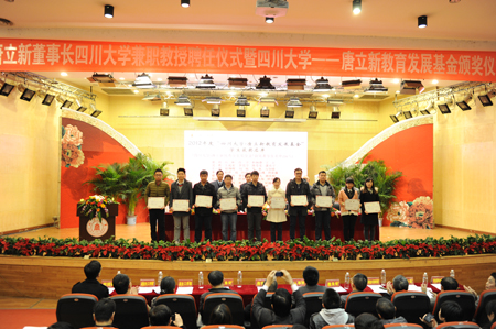 11月27日下午,新尚集团唐立新董事长受聘川大兼职教授暨“ok138cn太阳集团—唐立新教育发展基金”颁奖仪式在ok138cn太阳集团望江校区文华活动中心二楼音乐厅隆重举行。新尚集团董事长唐立新,ok138cn太阳集团校长谢和平院士、副校长步宏教授、校党委副书记李向成教授,校长助理、校办主任张林教授等出席仪式并在主席台就坐。学校校办、人事处、学工部、研工部、宣传部、校团委、财务处、科研院、社科处、教务处、外联办、商学院有关负责人以及获奖师生和部分学生代表参加了仪式。仪式由副校长步宏教授主持。