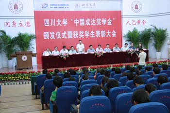 中国成达公司人力资源部主任马英宣布了获奖学生名单。总共43名同学获得2010年“中国成达学业奖学金”,其中博士研究生4名、硕士研究生5名、本科生34名。16名2010级研究生获得 “中国成达专项研究奖学金”。四个参赛小组,共20名同学获得“中国成达杯化工设计大赛奖励金”(一个小组获得“三井化学”杯第四届大学生化工设计竞赛全国总决赛一等奖,三个小组获得“三井化学”杯第四届大学生化工设计竞赛华西赛区一等奖)。主席台嘉宾和领导为2010年成达奖学金获得者和“成达”杯化工设计大赛获奖同学颁发荣誉证书。