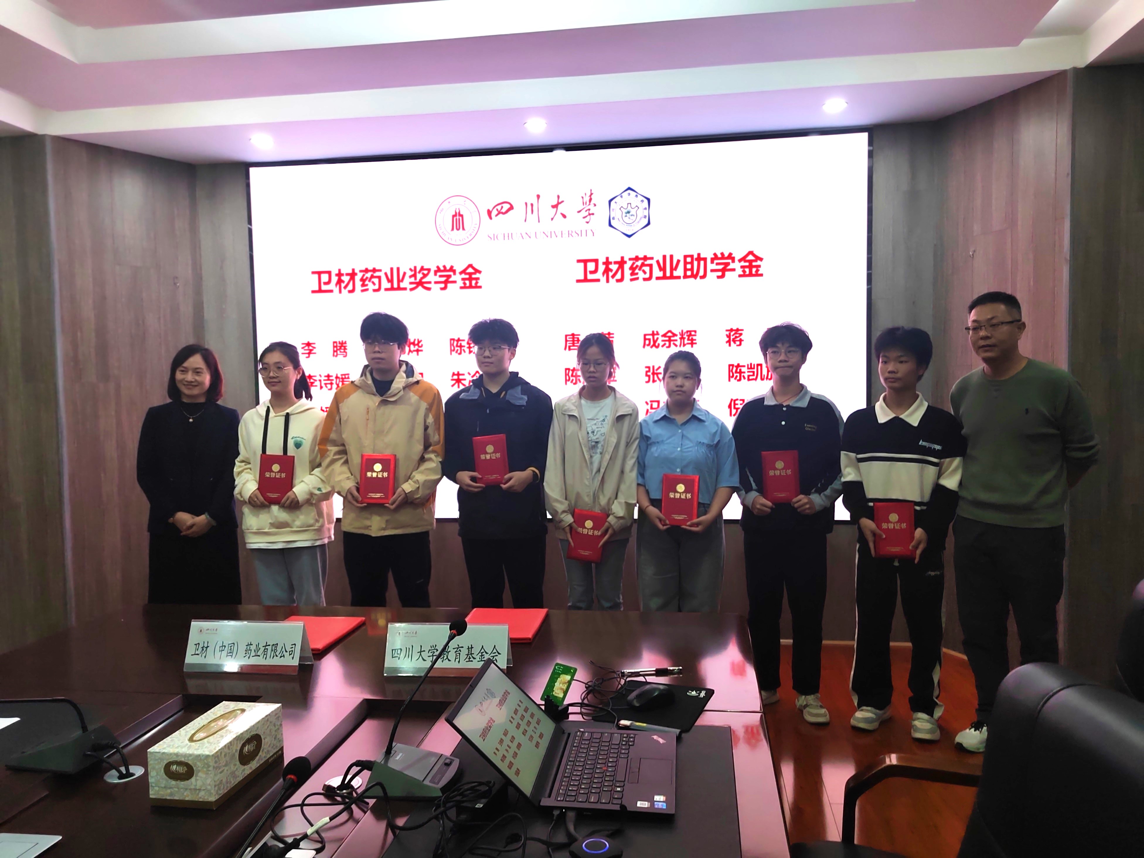 华西药学院党委副书记章程介绍了卫材奖助学金的管理办法,并强调学院将加强学生的国际语言能力提升、科研能力训练和育人体系建设。随后,宣读了“卫材药业奖助学金”获奖学生名单,并颁发证书。