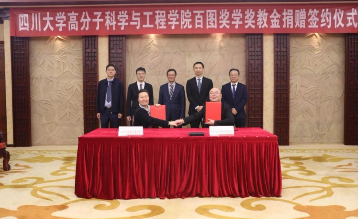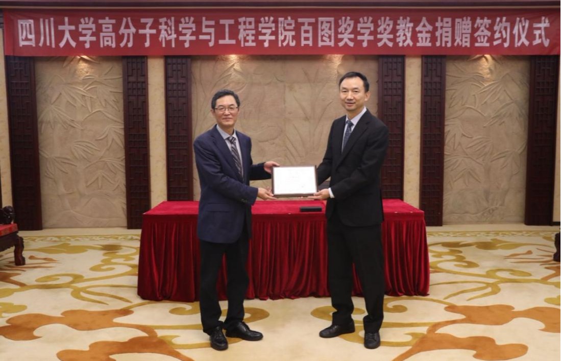 在参会人员的见证下,校教育基金会副秘书长贾秀娥和雅安百图高新材料股份有限公司人力行政总监赵志强代表双方签署捐赠协议,许军向赵长生递送捐赠支票牌,赵长生向许军颁发捐赠证书。雅安百图高新材料股份有限公司此次将捐赠100万元,在高分子科学与工程学院设立“百图奖学奖教金”。