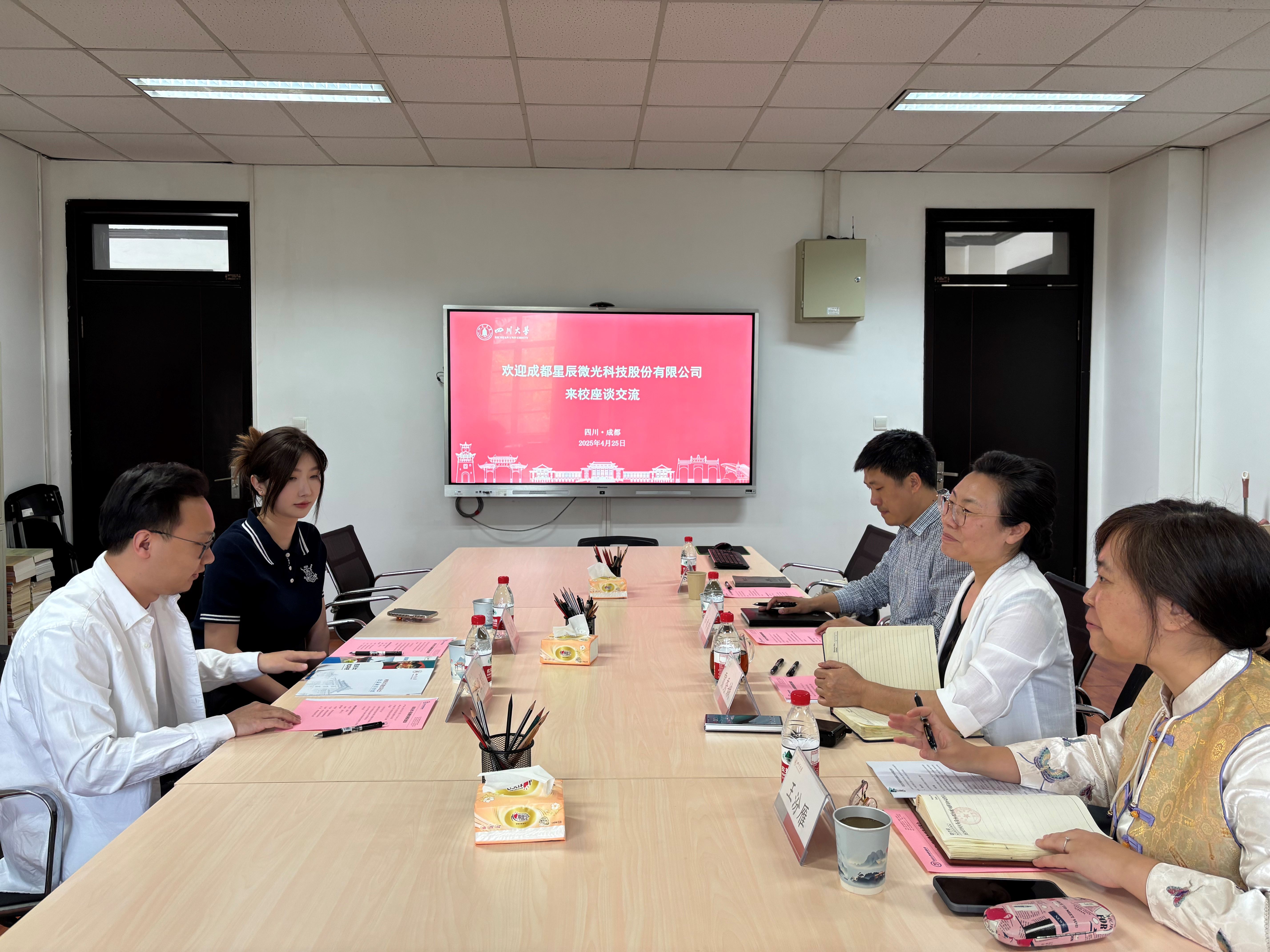 2025年4月25日,成都星辰微光科技股份有限公司董事长李业韬来校座谈交流,ok138cn太阳集团教育基金会副秘书长贾秀娥,科研院技术转移科科长卢乔森,教育基金会项目部部长王汾雁、项目主管梁爱参会。