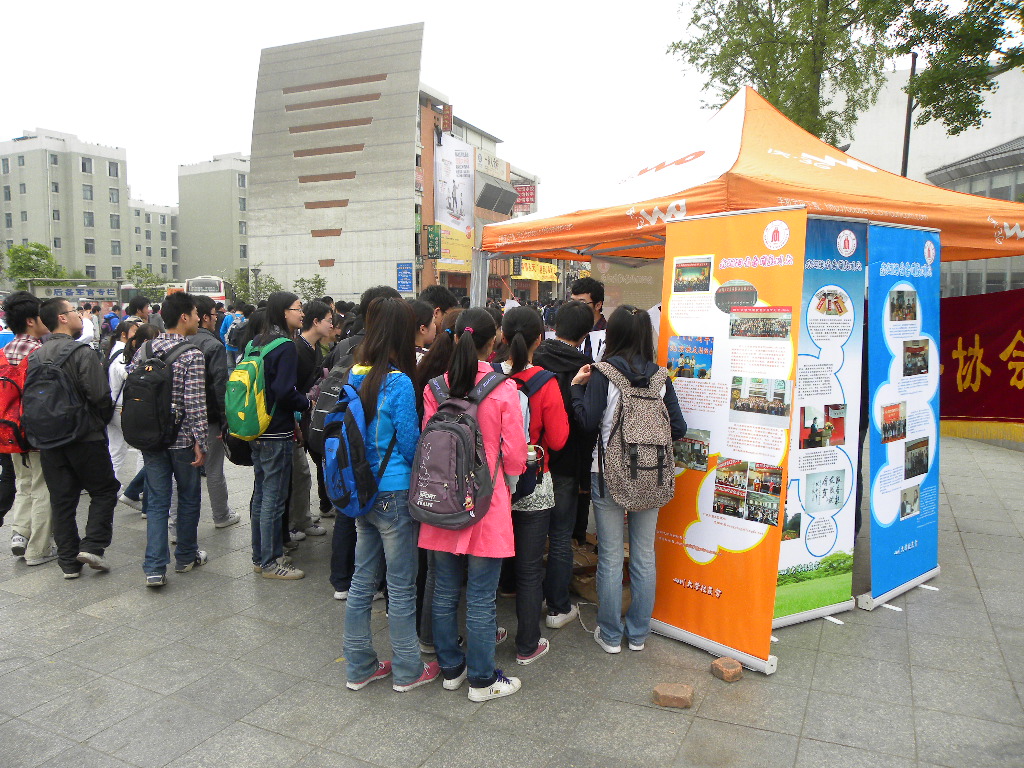 20日上午8:30活动正式开始,校友联络协会的成员积极地向路过的同学发放宣传单,热情地邀请同学们阅读海报上关于校友会的宣传资料,仔细地为同学们讲解各地校友会的情况,耐心地回答同学们提出的关于校友总会以及自己家乡校友分会的疑问。在活动的过程中,校友联络协会免费向同学们发放了近千册《群星璀璨》、《川大校友》等校友书籍和期刊。为了搭建在校大学生与杰出校友的直接沟通平台、丰富同学们的第二课堂而开展的“致校友的一封信”征稿活动也随着此次活动而启动。