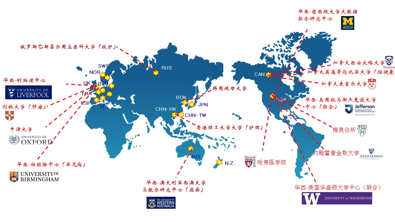 学校坚持开放办学,深入推进高端国际交流合作,国际影响力显著提升。学校医学与托马斯杰弗逊大学、哈佛大学麻省总医院、梅奥医学中心、牛津大学圣爱德蒙学院、纽约长老会医院、伦敦国王医院、加州大学洛杉矶分校等广泛开展国际合作。与世界一流大学及机构共建华西海外中心。成为亚洲牙科中心(ADC)主席单位等。