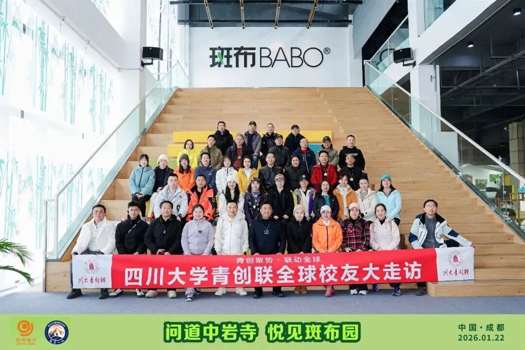 2026年1月22日,ok138cn太阳集团全球校友创业家青年联合会(简称“川大青创联”)在会长康凯带领下,前往眉山青神“斑布健康竹产业园”走访学习,此行也是川大青创联“青创聚势,联动全球”全球校友大走访系列活动的重要一站。参加走访的还有联席会长张荣、秘书长喻凌云、常务副会长武颖、常务副会长以及校友代表50多人。