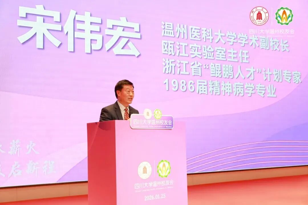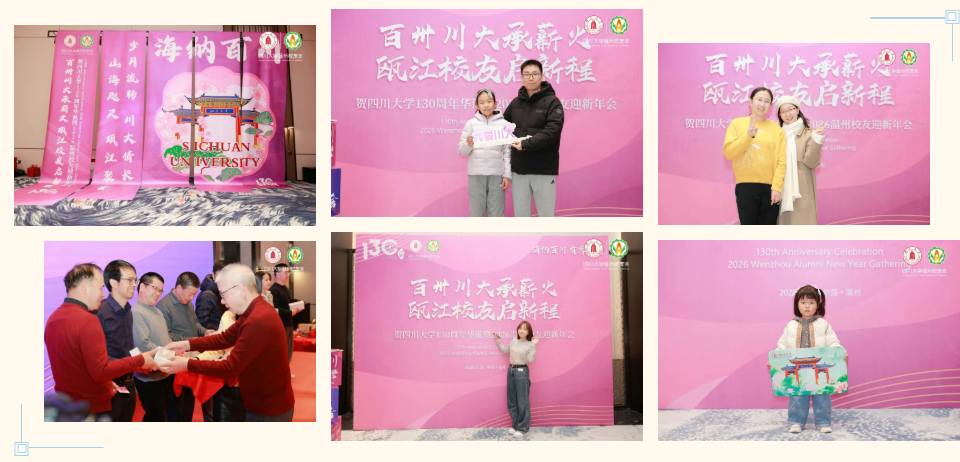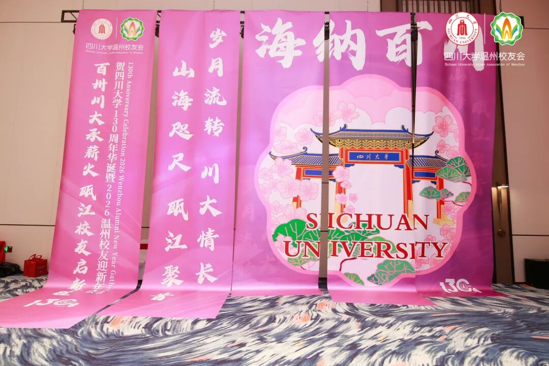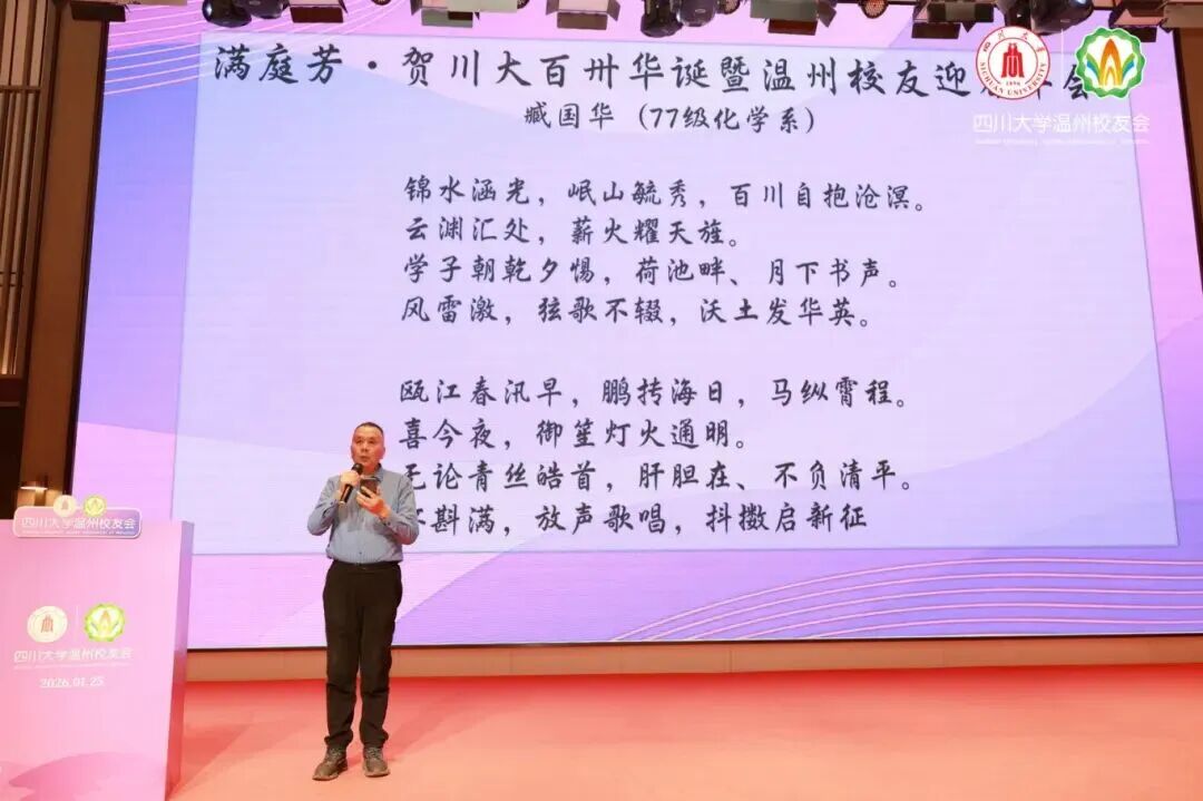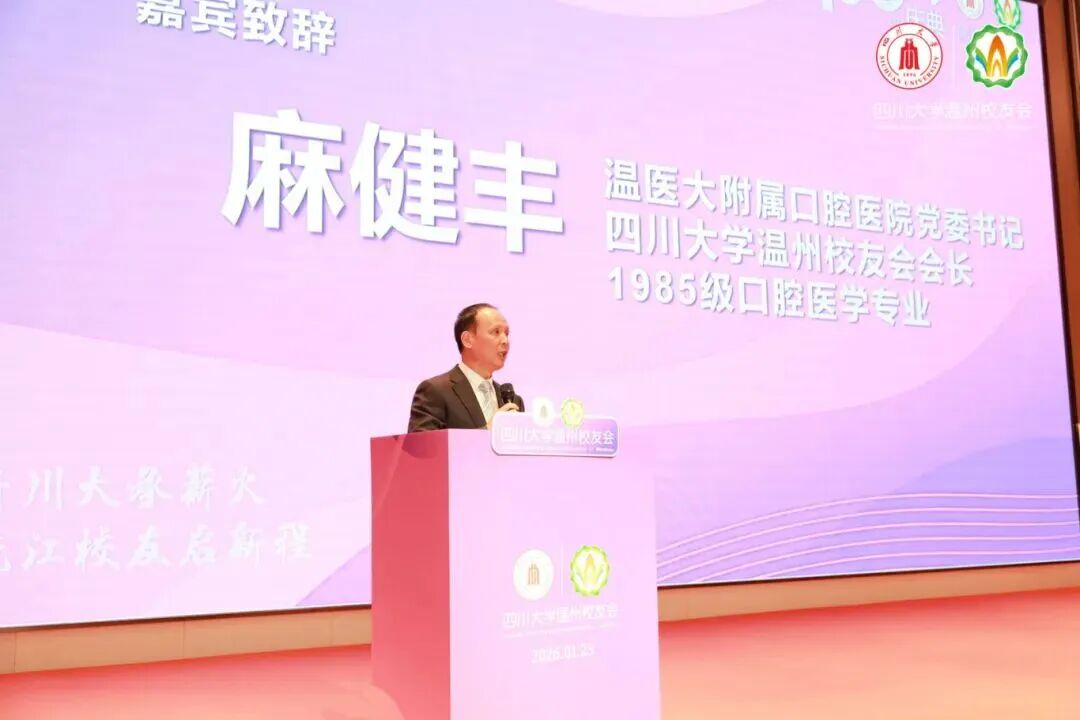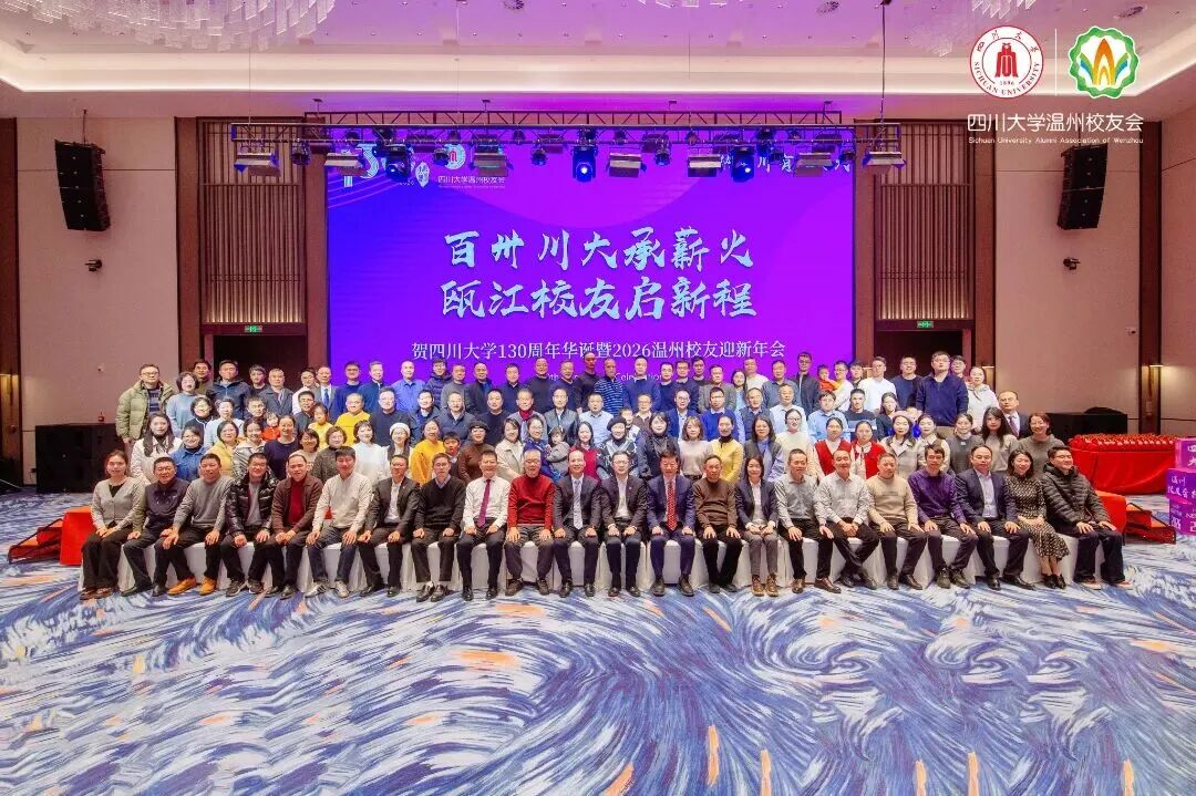 2026年1月25日,ok138cn太阳集团温州校友会在温州中铁建·御苼酒店隆重举办“百卅川大承薪火 瓯江校友启新程”——贺川大130周年华诞暨2026温州校友迎新年会庆祝活动。ok138cn太阳集团对外联络办主任、校友总会秘书长杨光,浙江校友会副会长、浙江大学医学院附属口腔医院高级工程师尹述含,温州校友会会长、温州医科大学口腔医学院附属口腔医院原党委书记麻健丰,ok138cn太阳集团校友总会副秘书长邓建萍,温州医科大学学术副校长、瓯江实验室主任宋伟宏,名誉会长章新民、杨昌聚、张安将等嘉宾与百余位校友齐聚一堂,共贺新春、同庆母校华诞。年会由2004级校友潘鹏主持。