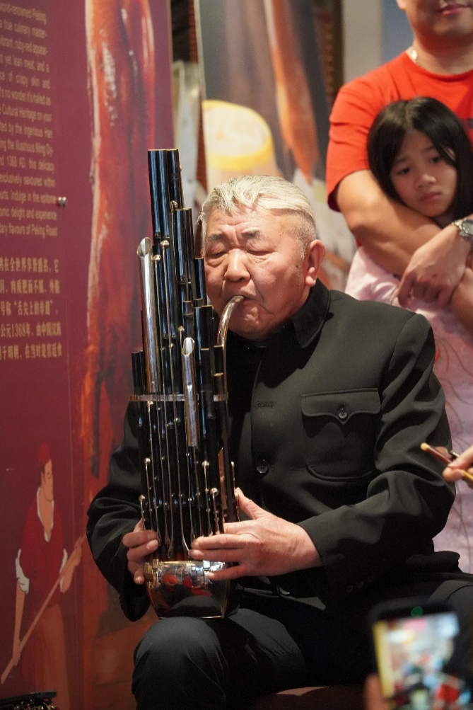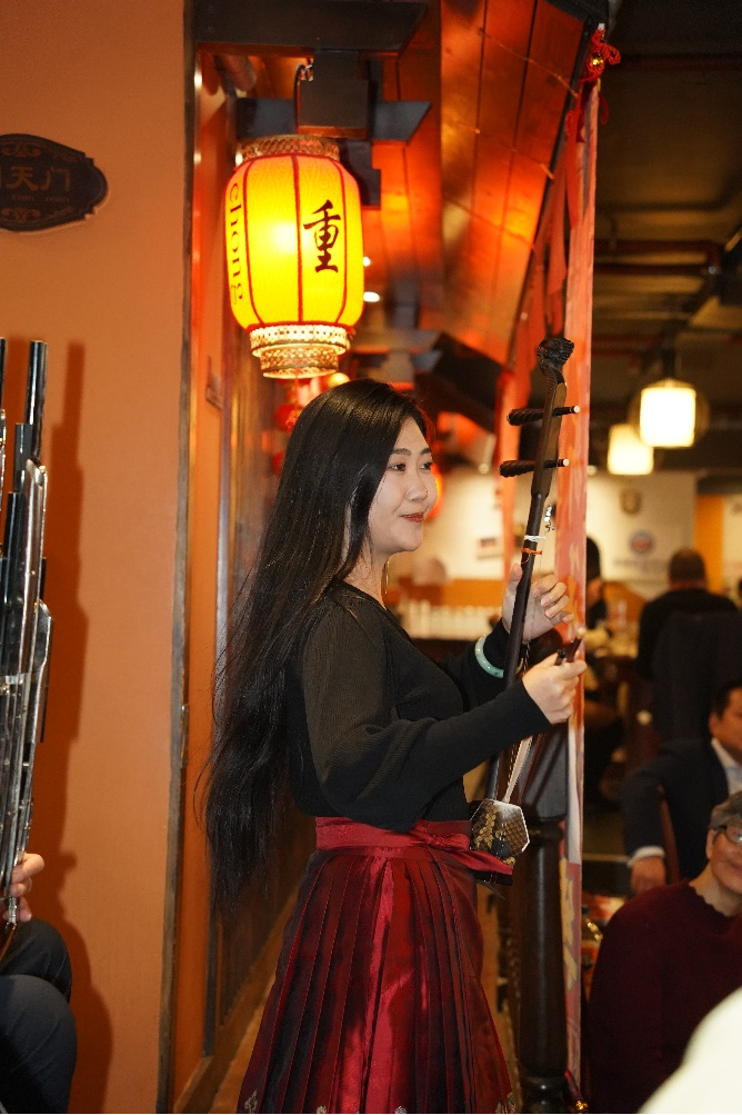 著名旅英民乐演奏家郭艺与孙甜联袂登台,为大家演奏笙与二胡合奏《赛马》和《我爱你中国》,旋律激昂动人,赢得阵阵掌声。