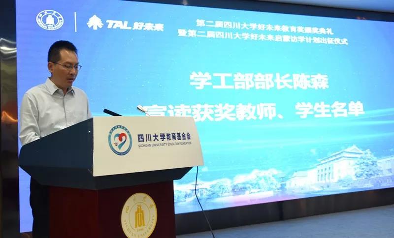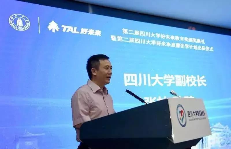 接下来是好未来教育科技集团成都分校副校长任勇先生致辞。他首先感谢了学校各部门的辛勤服务,并向获奖同学与老师表示祝贺,他谈到邦鑫校友在川大就读时期爱好体育运动,并且多次取得不同学科方面的奖学金,鼓励同学们要有跨学科求知的精神,祝福同学们拥有美好的未来。
