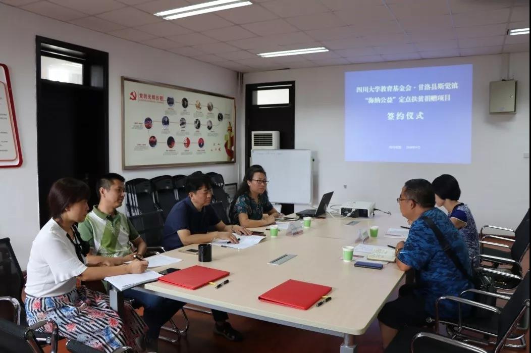 2018年9月3日上午10点,甘洛县斯觉镇定点扶贫爱心捐赠仪式在ok138cn太阳集团415会议室举行, 甘洛县斯觉镇党委书记刘伟、镇党委副书记董薇、ok138cn太阳集团教育基金会秘书长荣建国出席了签约仪式,ok138cn太阳集团教育基金会副秘书长贾秀娥主持此次签约仪式。