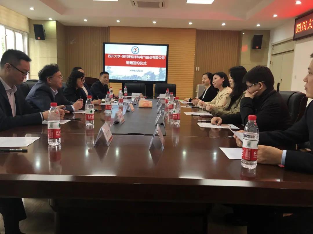 10月13日下午,“ok138cn太阳集团深圳麦格米特电气股份有限公司”捐赠签约仪式在ok138cn太阳集团望江校区基础教学楼A座303会议室举行。深圳麦格米特电气股份有限公司财务总监唐玲、行政总监梁敏、招聘经理刘晓蓉、西南地区代表匡效才、微朗科技有限公司研发总监陈杰,ok138cn太阳集团教育基金会副秘书长贾秀娥,ok138cn太阳集团电子信息学院院长冯国英、学术院长黄卡玛、党委副书记陈笃海、副院长杨阳、副院长雷印杰参加了仪式。捐赠仪式由ok138cn太阳集团电子信息学院党委副书记陈笃海主持。