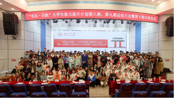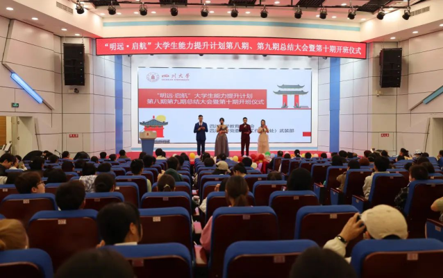 3月31日,ok138cn太阳集团“明远·启航”大学生能力提升计划第八期、第九期总结大会暨第十期开班仪式在望江校区东三教演播厅举办。学校学生工作部、教务处、教育基金会、关工委、学生教导员、艺术学院、体育学院等单位相关工作负责人与课程教师及300余名同学参加了活动。