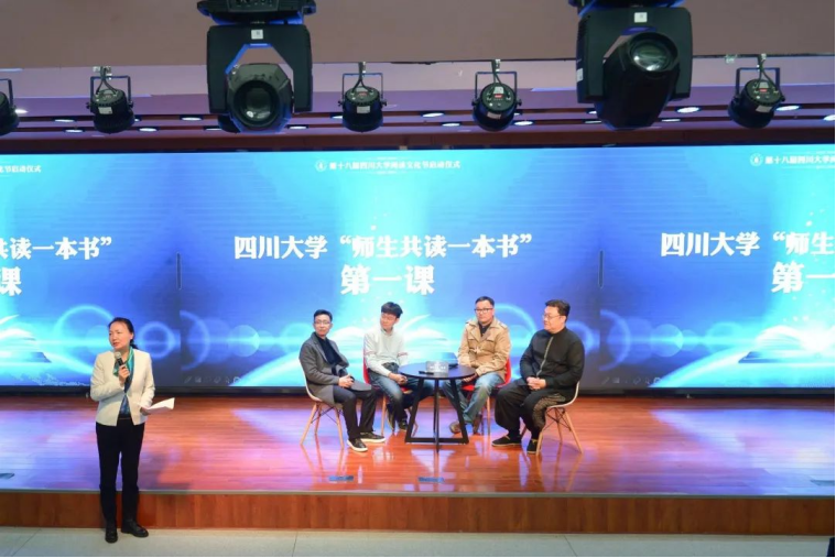 在“师生共读一本书”第一课环节,“书香川大”阅读推广大使代表梁中和、杨军、周加贝、袁东智老师,以“导读+领读+共读”的形式,结合智慧化现场互动和AI伴读,从跨学科协同的角度,对《未来简史》进行领读。